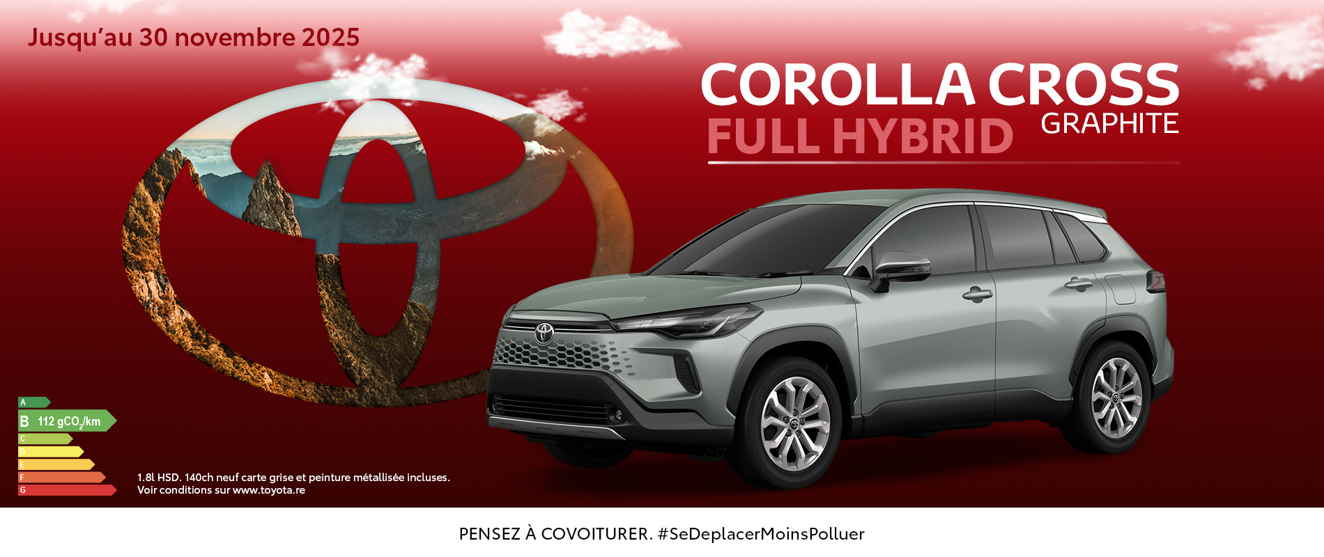 COROLLA CROSS Graphite à partir de 36 190€ : Prix remisé (3 500€) pour toute commande d’un TOYOTA COROLLA CROSS MC Graphite 1.8l HSD 140ch neuf carte grise et peinture métallisée incluses. Offre non cumulable avec toute offre de remise/reprise en cours et dans la limite des stocks disponibles uniquement du 15 octobre au 30 novembre 2025. Consommation en cycle mixte de 5.5 l/100km, émissions de CO2 : 112 gr/km.