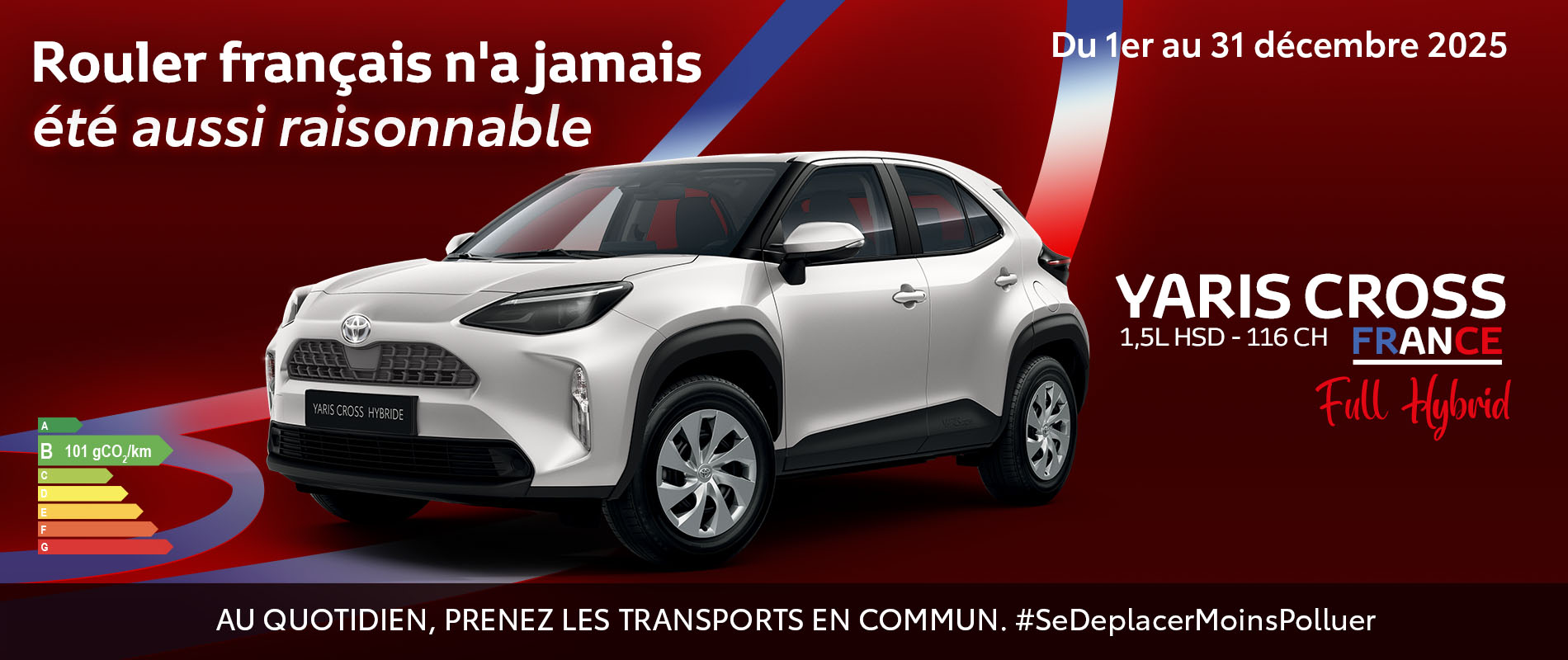 YARIS CROSS France Full Hybrid 1.5l HSD 116ch à partir de 27 990€ : Offre réservée aux particuliers sur base de YARIS CROSS Business, prix remisé (3 200€) pour toute commande d’une YARIS France Full Hybrid neuve, carte grise incluse et hors peinture métallisée et extension de garantie. Offre non cumulable avec toute offre de remise/reprise en cours, valable du 1er au 31 décembre 2025 et dans la limite des stocks disponibles. Consommation en cycle mixte : 4.7l/100km, émissions de CO2 : 101gr/km.