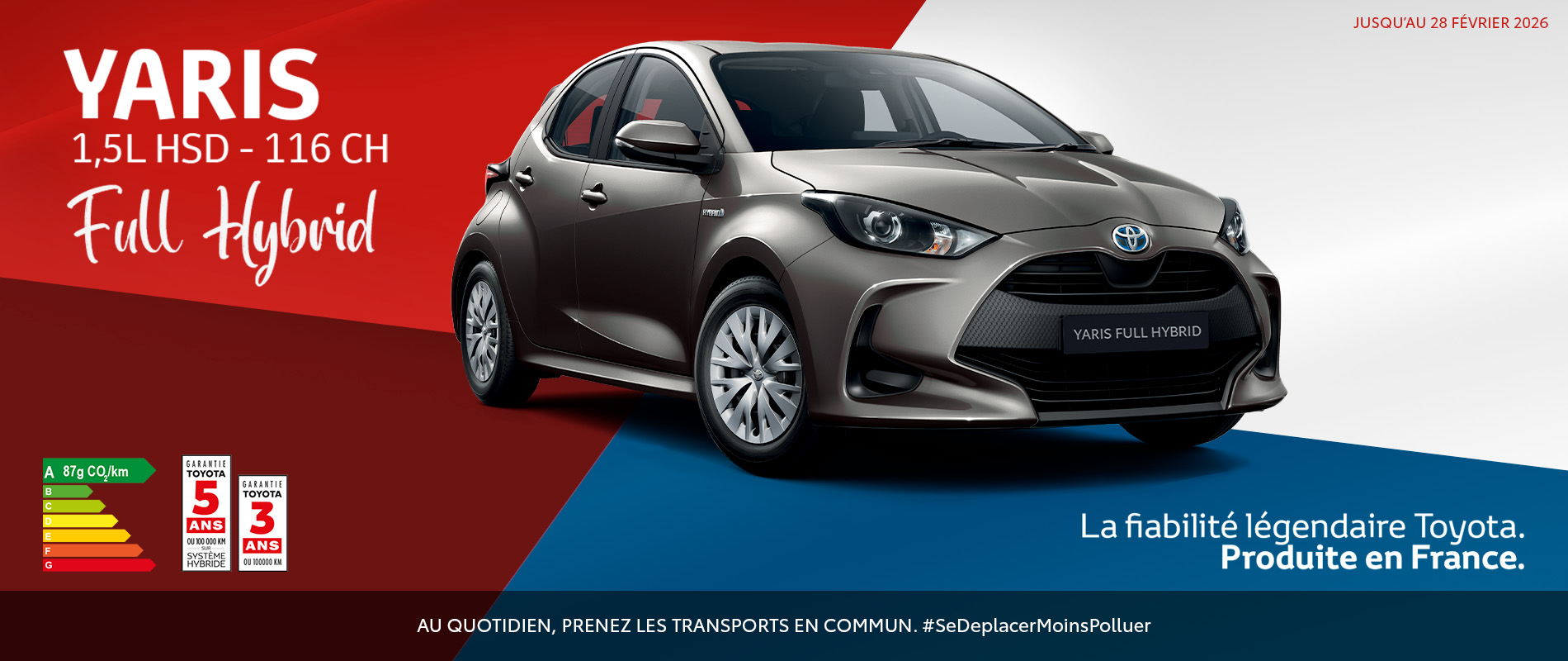 YARIS MC Minium 1.5l HSD 116ch Full Hybrid à partir de 23 390€ soit 320€/mois avec apport 2 100€ : Prix remisé (2 600€) pour toute commande d’une TOYOTA YARIS MC Minium 1.5l HSD 116ch neuve carte grise incluse, hors peinture métallisée et extension de garantie. Offre non cumulable avec toute offre de remise/reprise en cours et dans la limite des stocks disponibles uniquement du 02 janvier au 28 février 2026. TOYOTA YARIS MC Minium à partir de 319.17€/mois avec apport 2 100€ : exemple pour la location longue durée d’une TOYOTA YARIS MC Minium, neuve avec carte grise comprise, hors peinture métallisée et extension de garantie, consommation en cycle mixte de 3.8l/100km, émissions de CO2 : 87gr/km, sur une durée de 60 mois et 60 000km. 1erloyer majoré de 2 100€ puis 59 loyers de 319.17€TTC. Prix du kilomètre supplémentaire 0.17€ en sus, sous réserve du tarif constructeur en vigueur. Montants exprimés en TTC incluant la carte grise, hors peinture métallisée et extensions de garantie, hors prestations facultatives. Engagement de reprise en fin de contrat par le distributeur avec paiement des frais de remise à l’état standard et des kilomètres supplémentaires. Offre réservée aux particuliers, sous réserve d’étude et d’acceptation par le prêteur Crédit Moderne Océan Indien : SA au capital de 4 575 776 € agréée en qualité de société de financement, immatriculée au RCS de St Denis sous le numéro 333 353 944 – Siège social : 28 rue Lislet Geoffroy -CS 91028- 97495 Sainte Clotilde. Intermédiaire en assurance immatriculé sous le numéro 07029039 (www.orias.fr). CMM Automobiles, partenaire du bailleur n’est pas décisionnaire quant à l’octroi du crédit. Il travaille à titre non exclusif avec le bailleur.